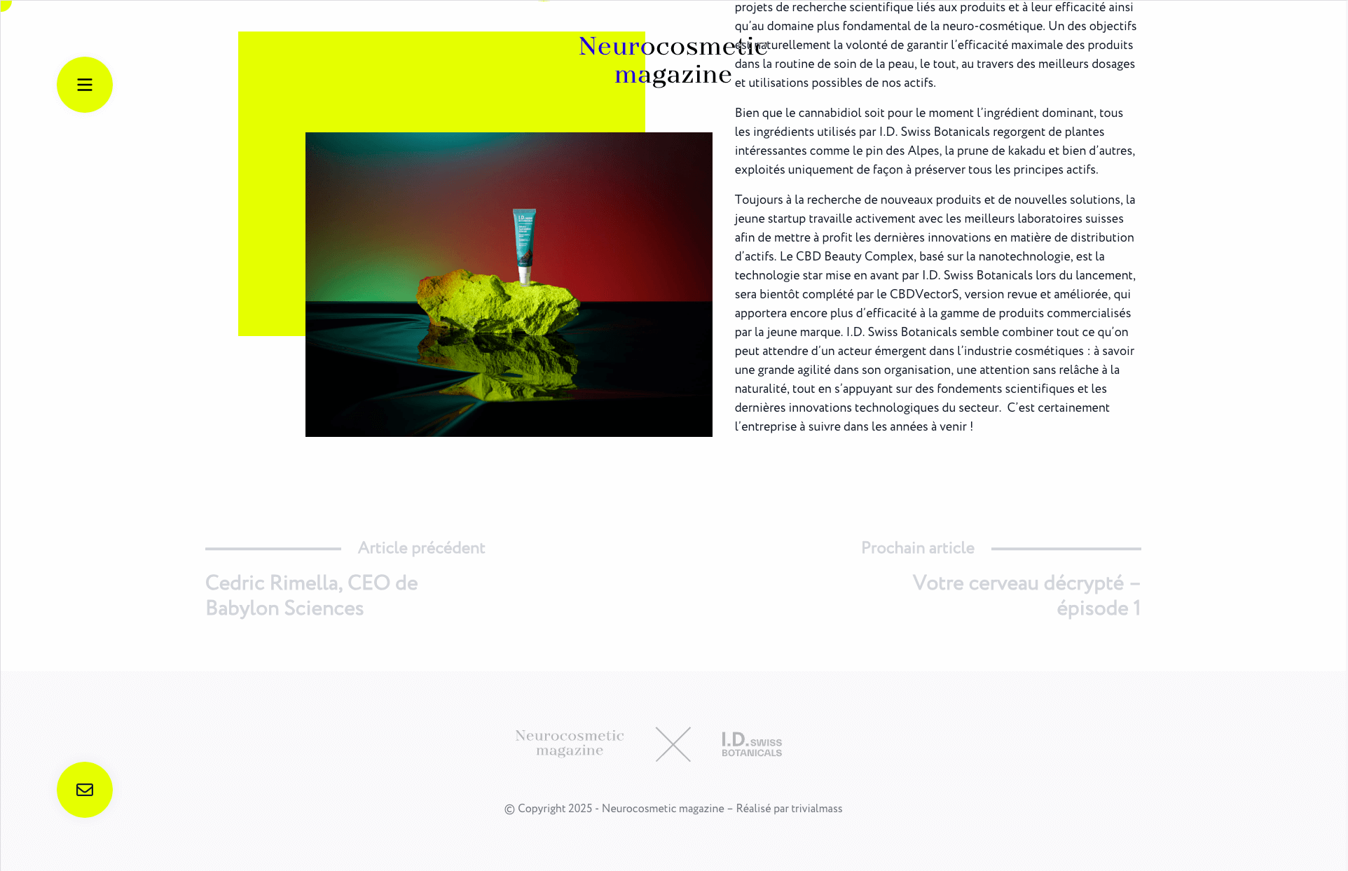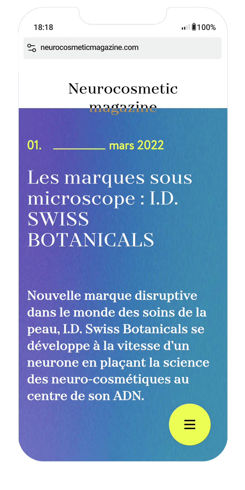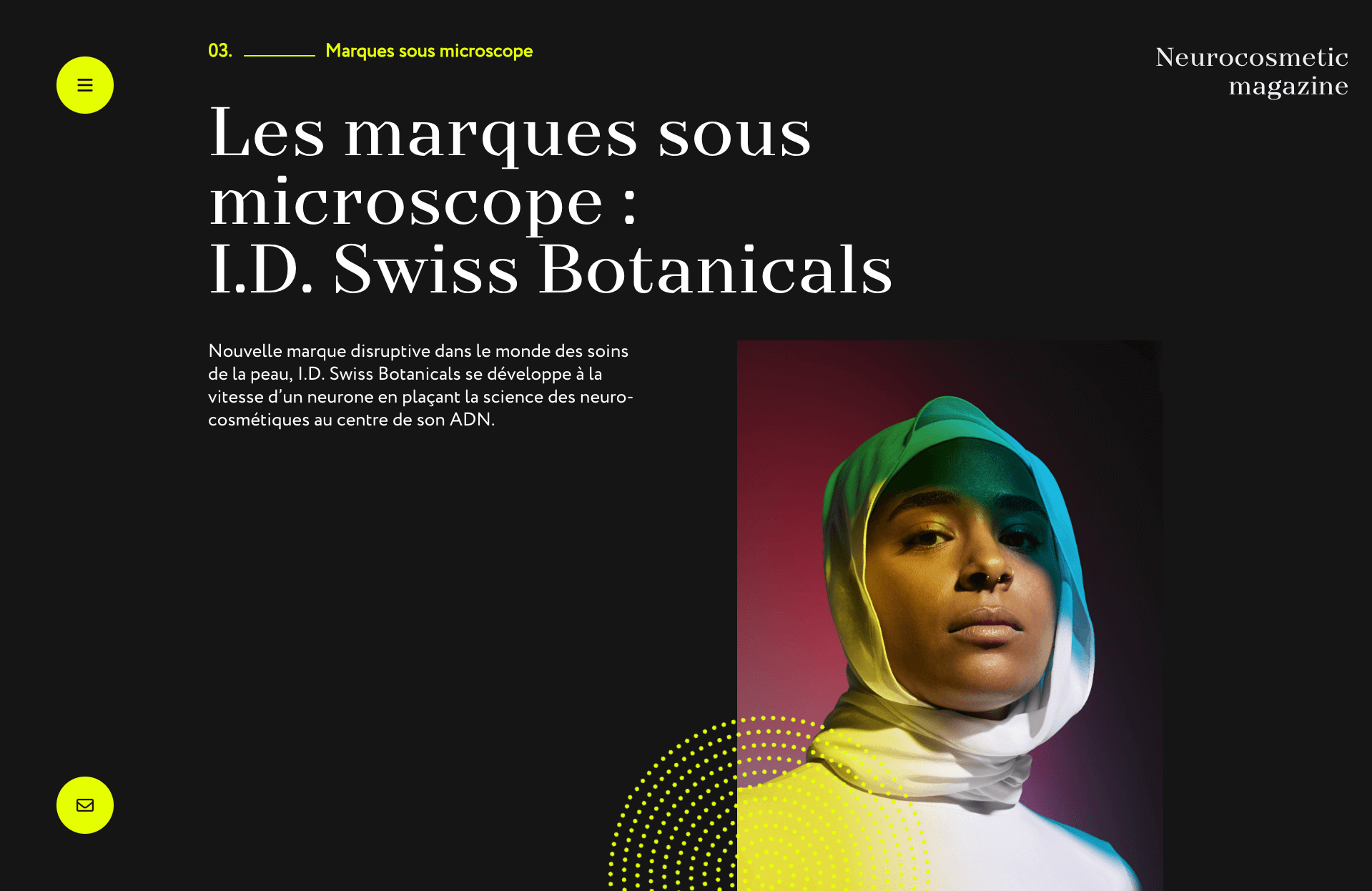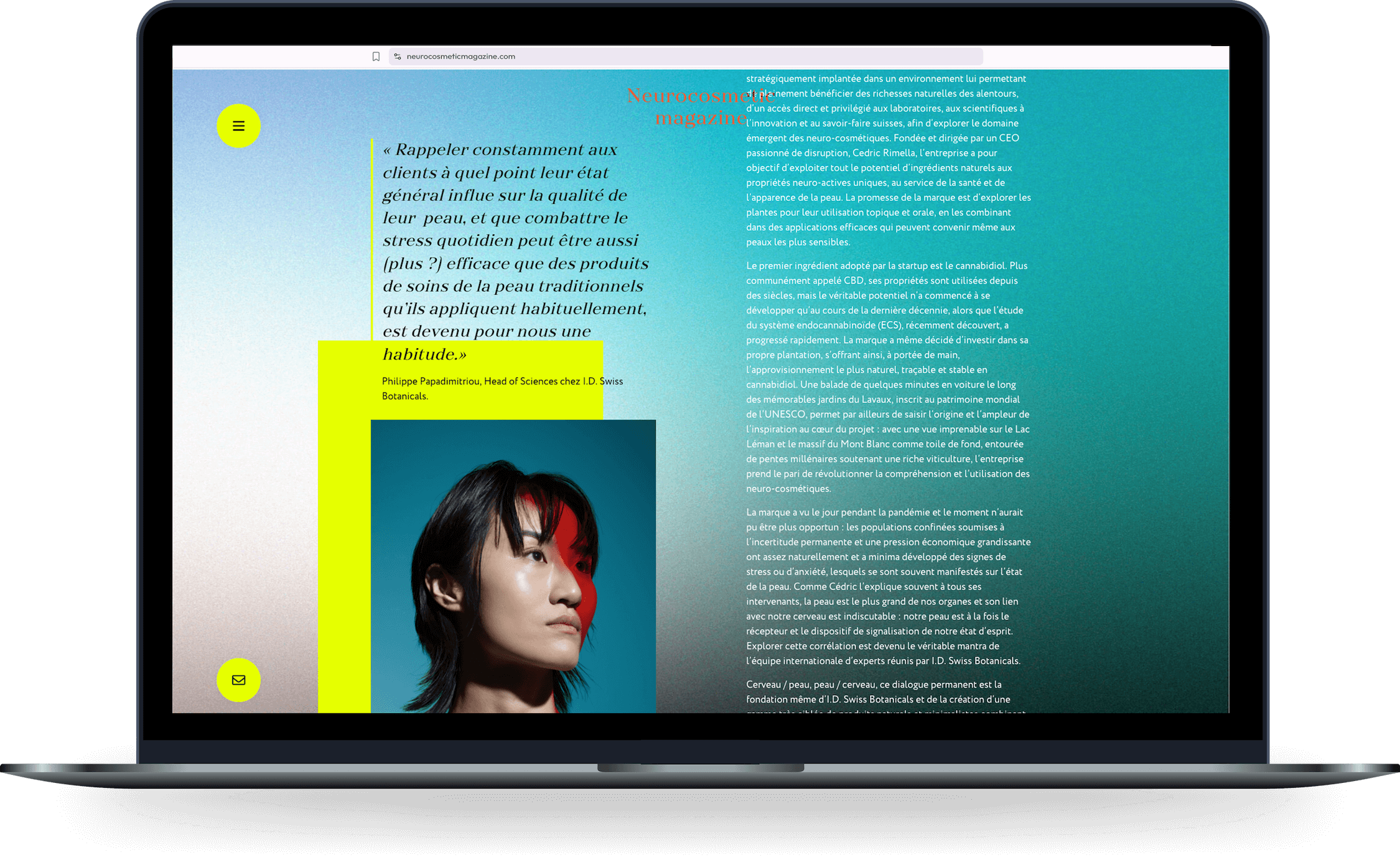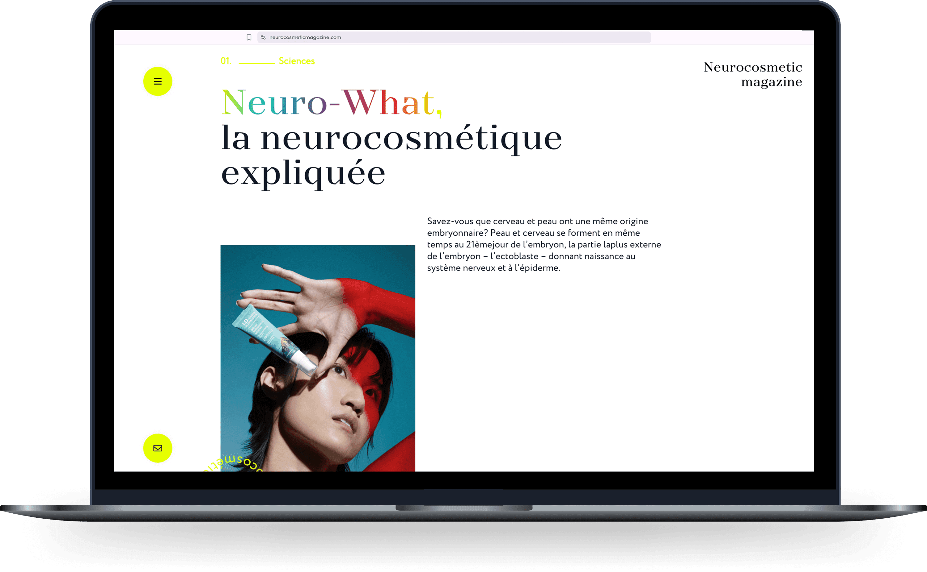Développement web d’un magazine en ligne consacré à la neuro-cosmétique, une discipline innovante et précurseure qui explore le lien entre le système nerveux et la peau afin de créer des produits capables d’influencer le bien-être émotionnel et physique. Le design, à la fois vibrant et audacieux, a permis d’explorer une dimension plus animée du développement front-end.